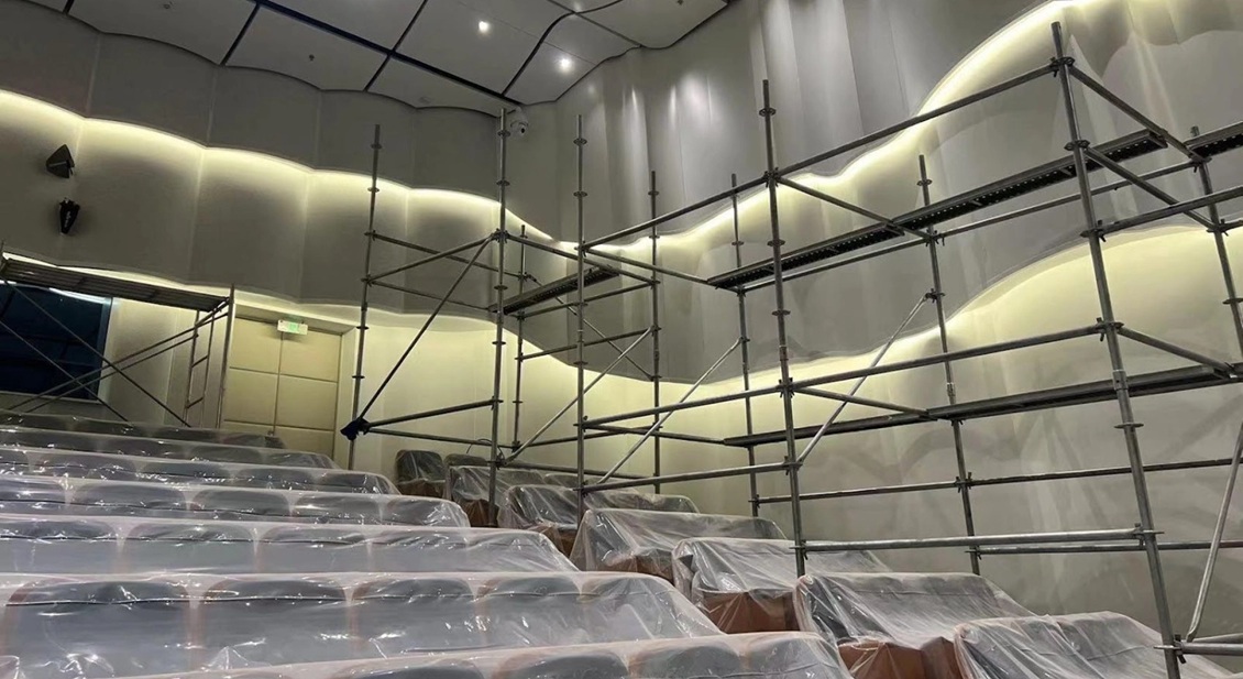 課題:寧波(二ンポー)青年会館の目的に不向きな布張りの音響パネルを、特注の強化されたアルミニウム製の代替品に迅速に交換すること。