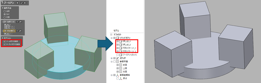 例として、ツールとターゲットの維持を設定する場合、ブーリアン(カット)の実行後、すべての要素が維持されます。