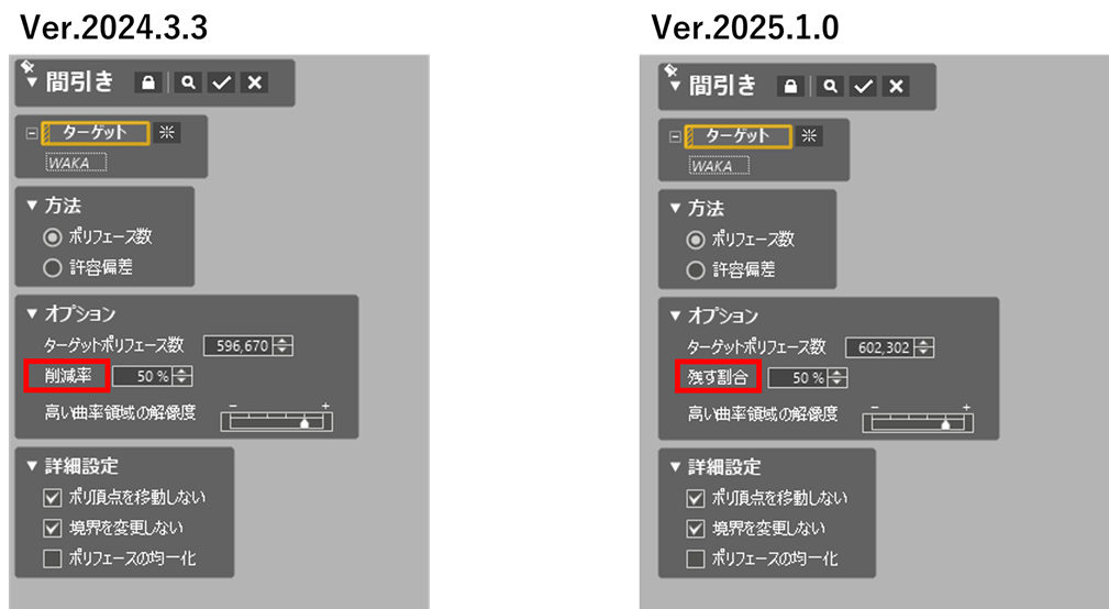 ● 縮小率オプションは「残る割合」に変更され、間引き後に残る点群の量が分かりやすくなりました。残す割合に20%を設定する場合、間引き計算後のメッシュは元データ量の20%を残る状態となります。