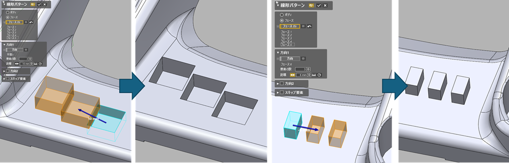 各種【パターン】コマンドにフェースオプションを追加しました。この機能では、作成したポケットや構造物に対して複製したいフェースをすべて選択し、複製の方向と要素数を設定することで、同じ形状を他の箇所に簡単に複製できます。