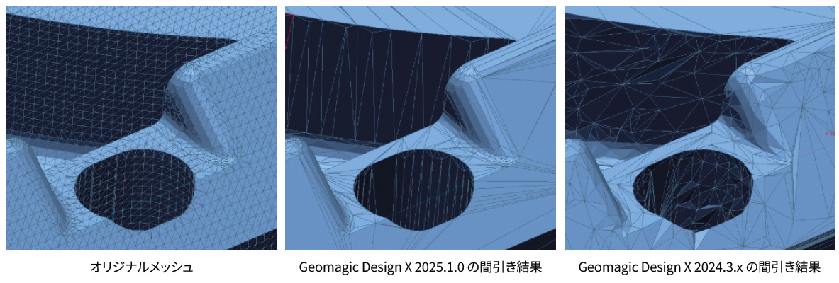 従来は、間引き処理後のメッシュデータでエッジ形状が崩れることがありましたが、今回の最適化により、間引き後もエッジ形状を維持できるようになりました。