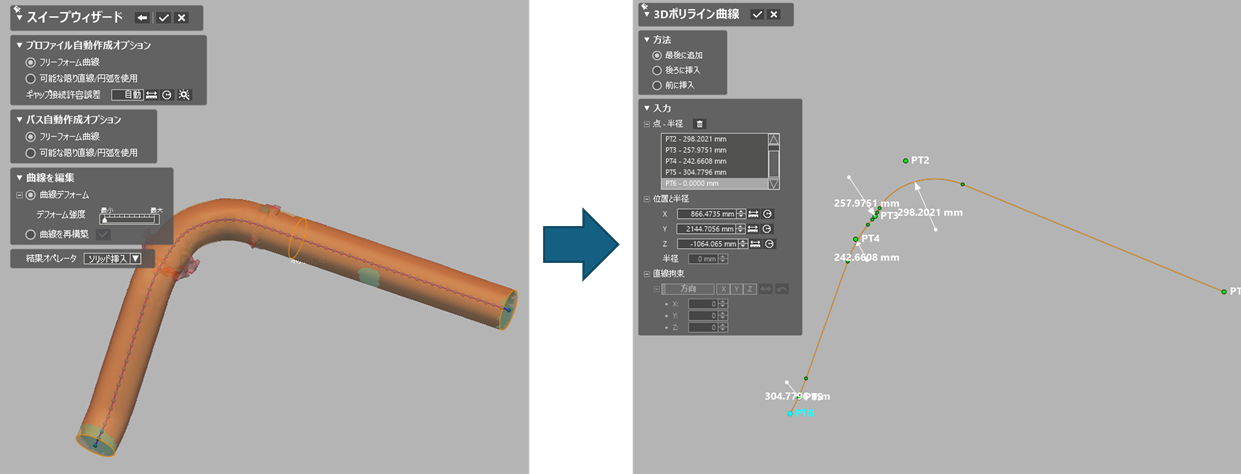 従来は、制御点に半径値を追加する際、設定パラメータ欄で数値を入力する必要がありましたが、最新版ではスケッチ描画と同様に画面上で半径値を直接調整できます。