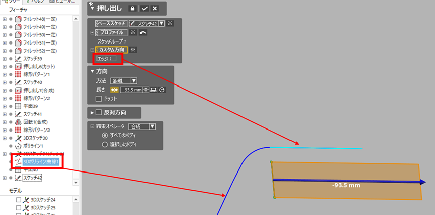 [直線 / 円弧を使用] オプションを使用してスイープフィーチャを作成すると、パスが 3D ポリラインとして出力され、編集と管理が簡単になります。