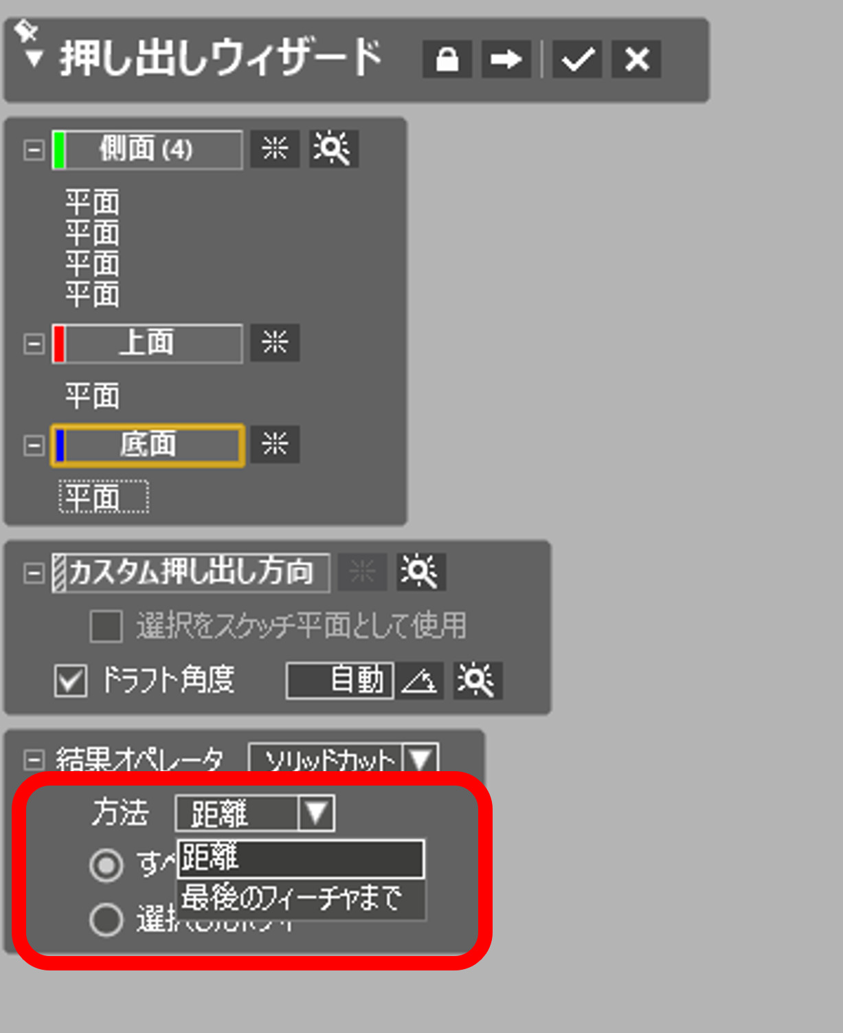 [結果オペレータ]、[押し出しウィザード] のサブチェックボックスが、「方法」ドロップダウンリストになり、[距離] か[最後のフィーチャまで]のいずれかの方法から選択 できるようになりました。