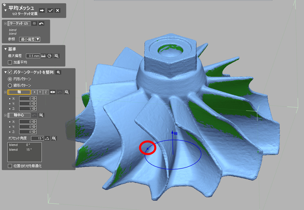 【パターンターゲットを整列】と【円形ターゲットパターン】オプションから平均メッシュを生成すると、選択したターゲット要素の回転軸と方向(赤枠部分)が画面に表示されます。これにより、プレビューに軸とその回転方向の逆が表示されるケースを防止し、より正確な平均メッシュ結果を確保します。