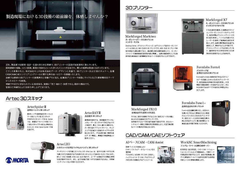 開発期間の短縮、コスト削減、業務の効率化といった多くのメリットが注目され、導入の裾野は急速に広がっています。 こうした背景のもと、株式会社モリタ共同出展の「3D Printer & 3D Scannerセミナー展示会」に、3Dプリンタおよび3Dスキャナ、各種 CAD/CAM/CAEエンジニアリングツールを実機展示いたします。
