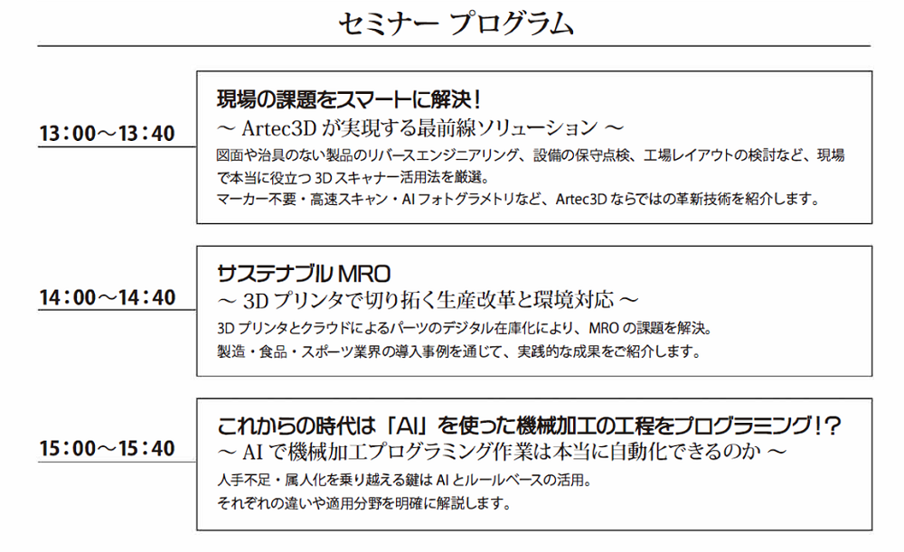 会場では最新の3Dプリンタの実機展示と実演や造形サンプルに加え、金属3Dプリンタや樹脂リサイクルなどの最新動向をテーマにしたセミナーも実施します。現場で今まさに求められている3D技術を、実際に「見て・触れて・体感できる」絶好の機会です。皆様のご来場を心よりお待ち申し上げております。