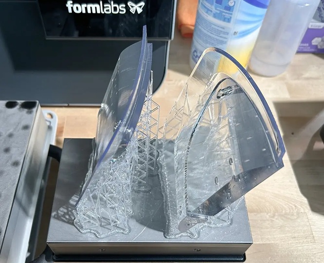 Thiebaud氏は照明システム用の小型部品や輸送機器の内装デザイン(シート、ダッシュボード、キャビンのフィニッシャーなど)、さらには建築用の縮尺模型などの試作を行っています。これらの部品の中には高温に耐え、化学物質に対する耐食性が求められるものもあります。こうした特性を必要とする試作品には、Thiebaud氏はFormlabsのレジンの中で最も高い熱たわみ温度(HDT)を誇るHigh Tempレジン(238°C@0.45MPa)を使用しています。