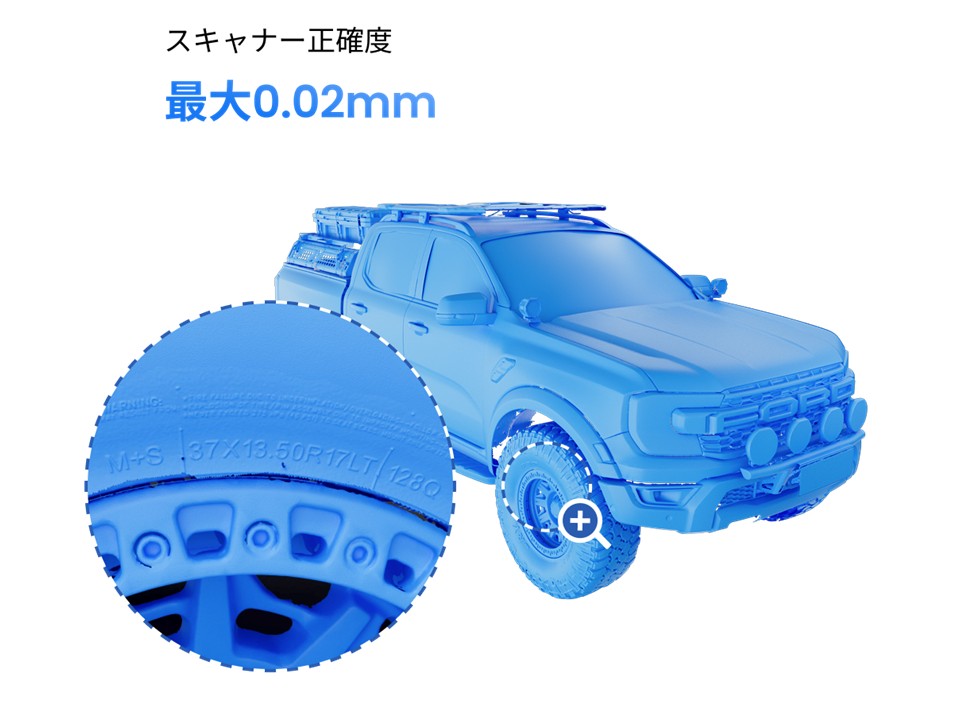 コインから車両まで、ブルーレーザーが暗部・光沢面も正確捕捉。クロスラインモードで表面を高速スキャン、シングルラインモードで深い溝もカバー。ハンドヘルド単体使用も可能。