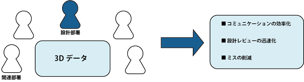 ・DR用3Dデータとして活用-3Dデータでデザインレビューを行なうことで、より密度の濃い結果をもたらしてくれます。重たいCADデータより軽快に動作するViewerデータを使用することで作業効率も大幅にあがります。