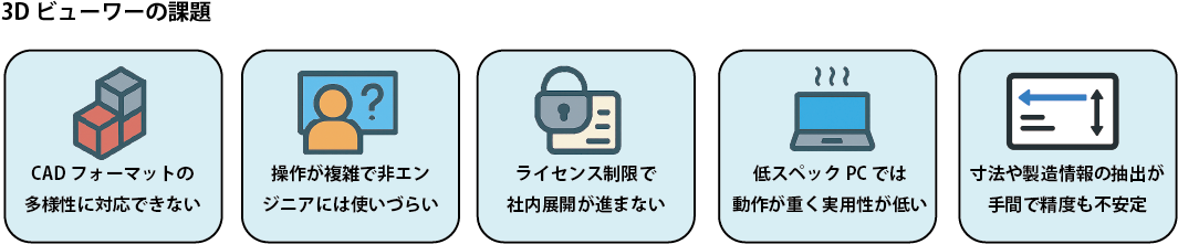 3Dデータの活用は、その視認性の良さから社内外でのコミュニケーション方法の一つとして長年期待されてきました。しかし、実際の現場では「CADフォーマットが多すぎてすべて対応するには構築費用がかかりすぎる」、「CAD操作は覚えられないしコミュニケーションツールもそれなりに難しい」、「低スペックPCでは3D表示が重たい」、「精度の高い3D情報を抽出することが出来ない」、などの課題が今でも残っています。