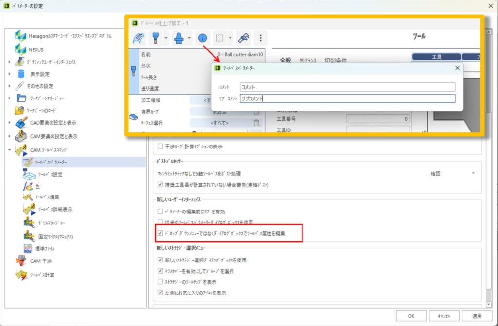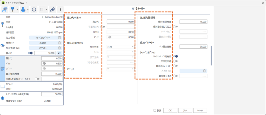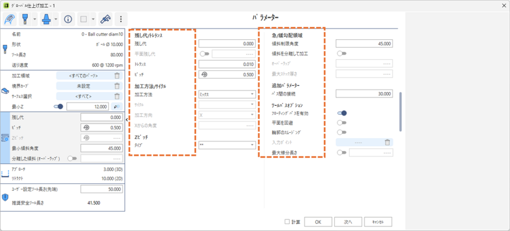 新しいツールパスパラメーターのダイアログ