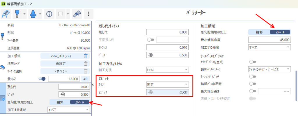 固定Zピッチを定義することで、急勾配や緩勾配領域でのブルノーズ工具の使用が改善されます。