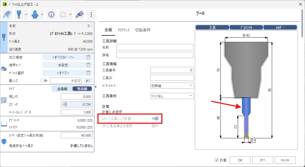 バージョン2025.3では、プロファイル工具でツールパスをプログラムする場合、ストレート工具として計算オプションが有効になり、デフォルトでグレー表示されます。