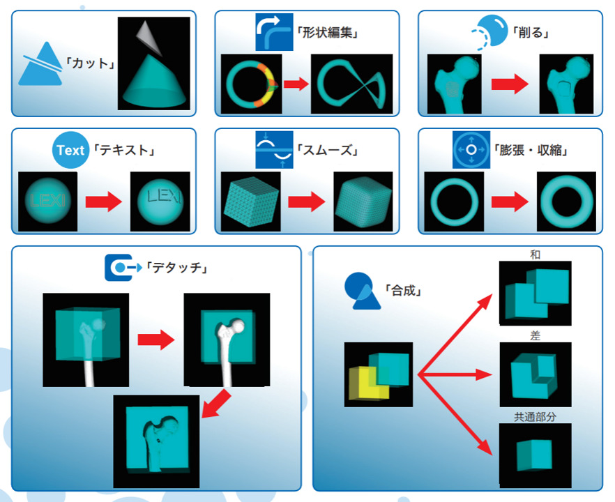 ・ モデル表面の変形 ・ モデル同士のデタッチや合成 ・ エラーの検出、修復 |